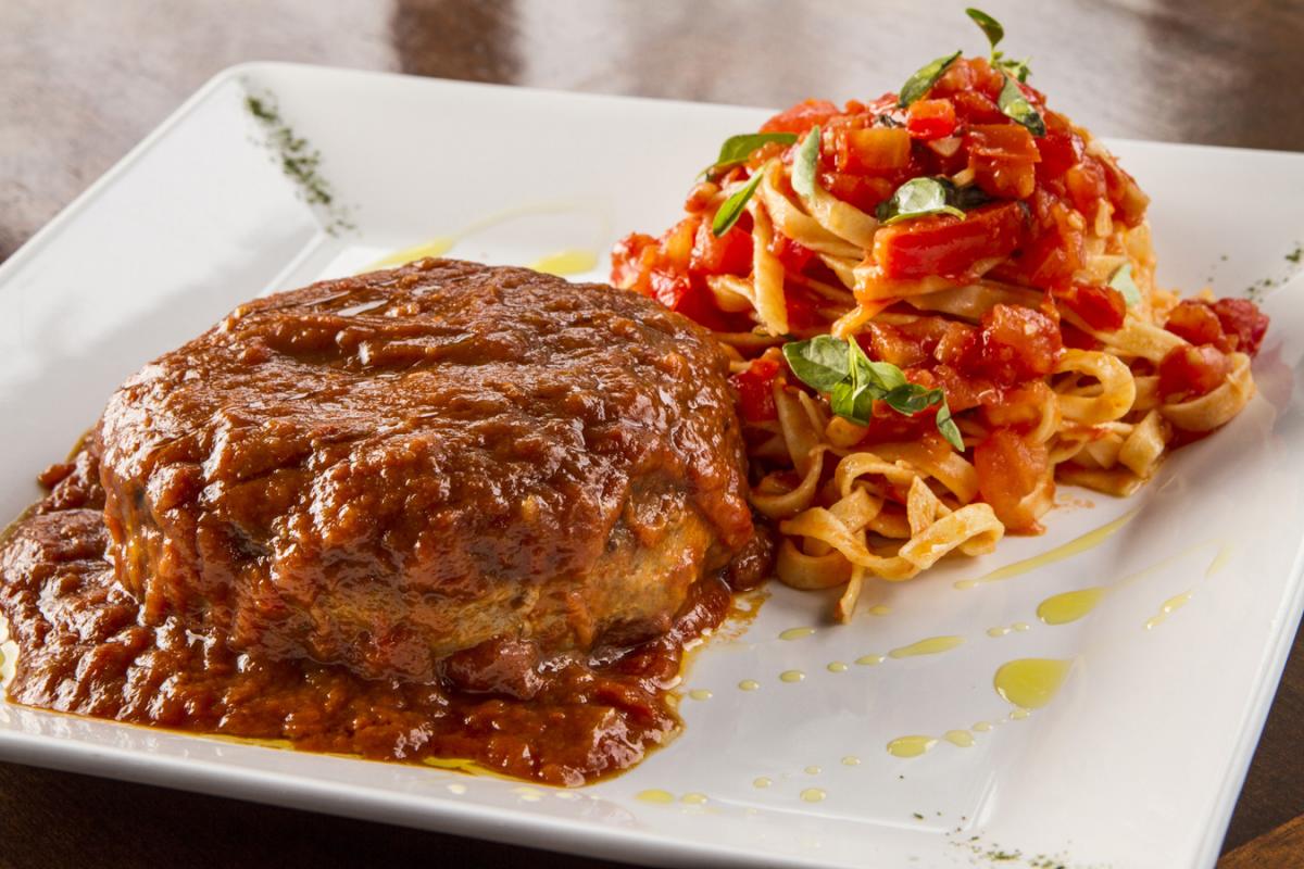 Polpetone com mussarela de búfala e spaghetti de batata doce