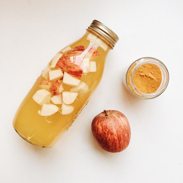Em 1 litro de água filtrada, coloque meia maçã (se for pequena, use a fruta inteira) bem picada e 1 colher de chá de cúrcuma.