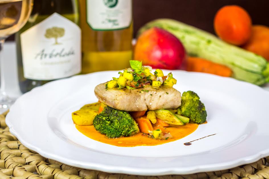 Peixe do dia com vegetais assados e saladinha de manga verde (Foto: Reprodução)