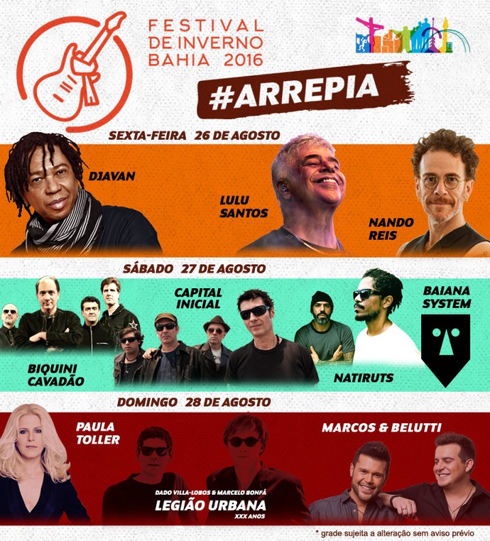 No palco, nome como Djavan, Lulu Santos e Nando Reis, todos no dia 26. O dia 27 promete shows de Biquini Cavadão, Capital Inicial, Natiruts e Baiana System. O encerramento, no dia 28, fica a cargo de Paula Toller, Dado Villa-Lobos e Marcelo Bonfá (na turnê dos 30 anos de Legião Urbana) e a dupla Marcos e Belutti.