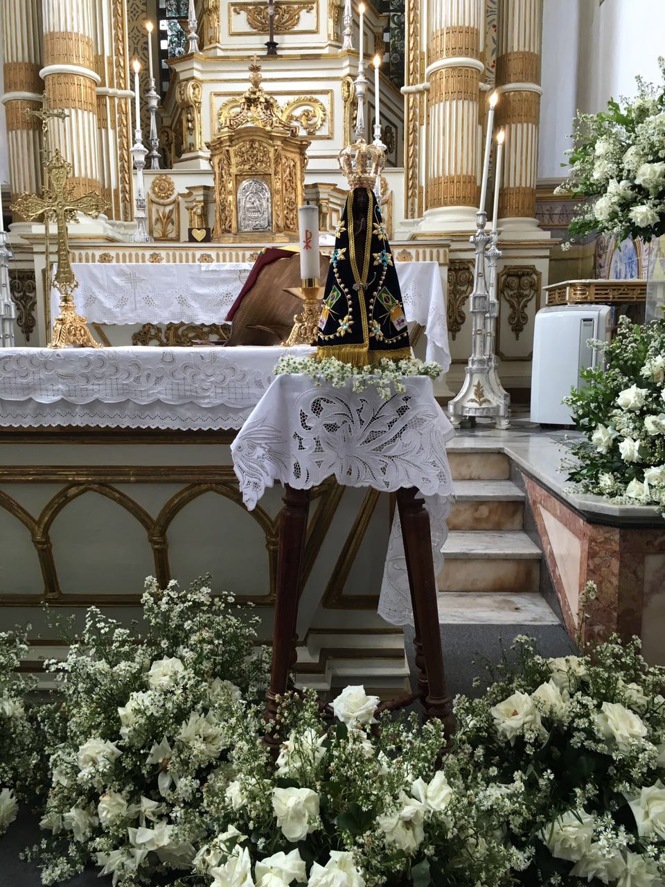 Ontem, Nossa Senhora da Aparecida passou o dia na Igreja da Vitória rodeada de flores e repleta de fieis.