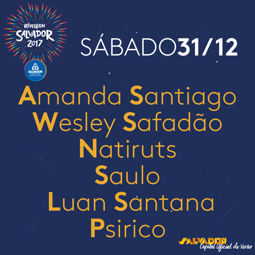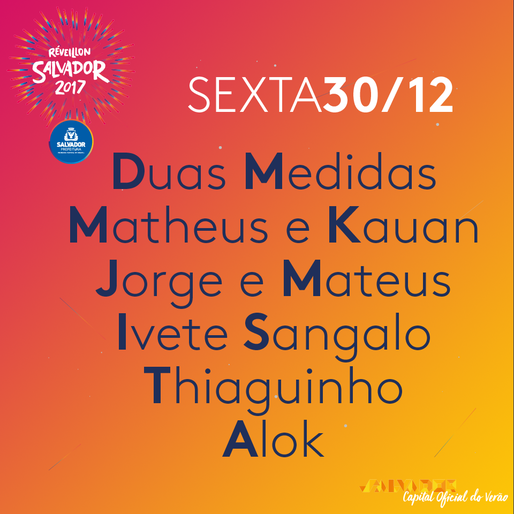 "O maior e melhor Réveillon do país vai rolar aqui, na #CapitalOficialDoVerao! Imagine aí: serão 5 dias de festa, 28 shows e 50 horas de música, lá na Praça Cairu. Estão preparados?"