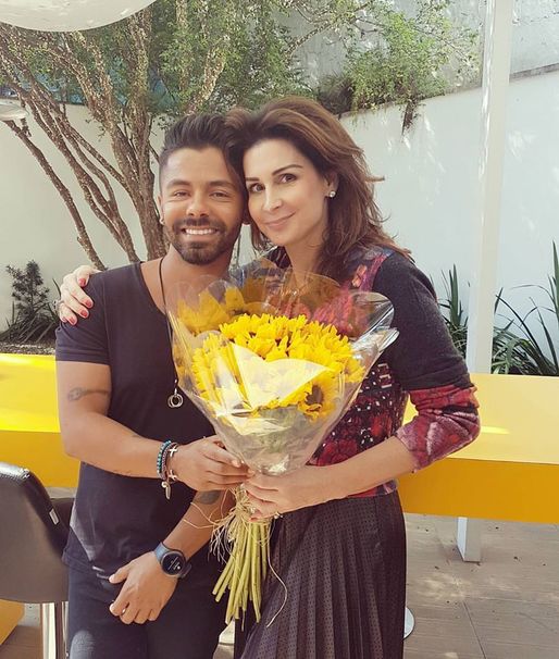 A aniversariante do dia 21 de dezembro, Tereza Cury recebendo flores de seu funcionário (Foto: Reprodução)