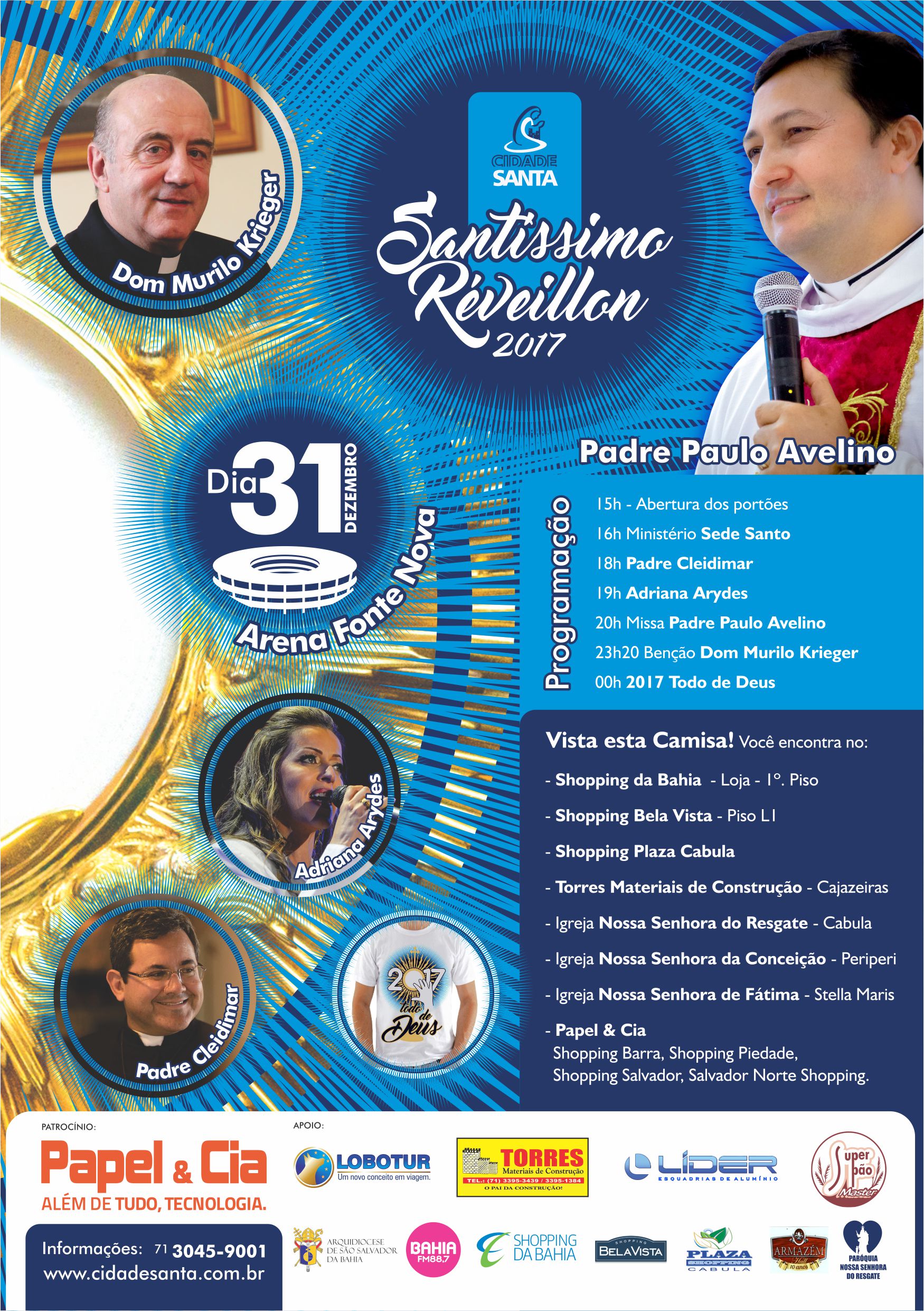 Uma noite de bênçãos, entrega, adoração e louvor para saudar o Ano Novo. Assim será o Santíssimo Réveillon, que acontecerá no dia 31 de dezembro, na Arena Fonte Nova, para receber 2017. Quem realiza o evento é Padre Paulo Avelino, pároco da Igreja Nossa Senhora do Resgate e fundador da Cidade Santa e terá a presença de Dom Murilo Krieger, Arcebispo de Salvador e primaz do Brasil, da cantora católica Adriana Arydes e do Padre e cantor Cleidimar Moreira.