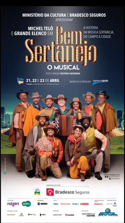 No dia 21 de abril estréia no Tom Brasil,em São Paulo, "Bem Sertanejo, o Musical sobre a história da música sertaneja. Protagonizado pelo brilhante Michel Teló.
