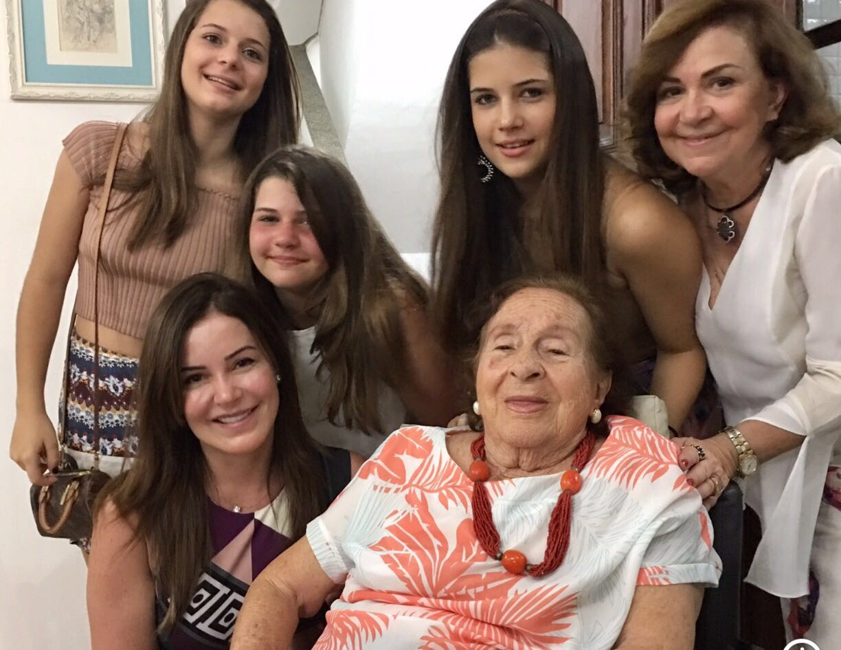 Várias gerações: Stella Brusell com sua mae Yvonne Santos Souza, sua filha Larissa Brusell Coelho e as netas Nina, Isabella e Carolina. (Foto: Reprodução)