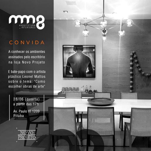 Amanhã (28), a partir das 17 horas, o artista plástico Leonel Mattos estará presente em um bate-papo na loja de móveis e decoração Novo Projeto. Na ocasião, ele falará um pouco sobre a escolha das obras de arte para os diversos ambientes. O evento faz parte do petit comité que tem sido promovido pela Novo Projeto para que o público conheça suas novas instalações, agora em ampla unidade, na Av. Paulo VI, Pituba.