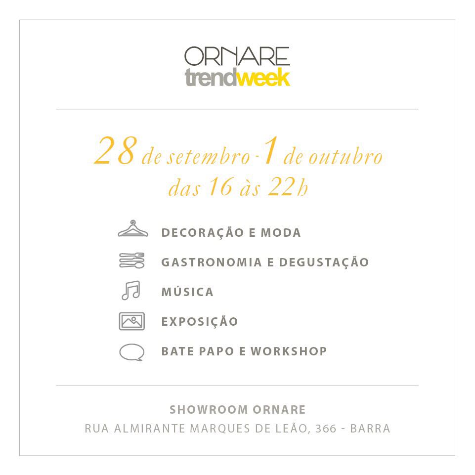 E vem por aí decoração e moda, gastronomia e degustação, música e exposição. Trata-se da Ornare trendweek de 28 de setembro a 1 de outubro no showroom Ornare.
