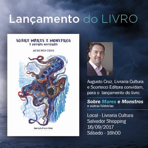 O escritor e advogado Augusto Cruz se prepara para lançar, neste sábado (16), seu novo livro de contos, intitulado “Sobre Mares e Monstros e Outras Histórias”. O lançamento vai acontecer na Livraria Cultura do Salvador Shopping, às 16 horas. O livro retrata histórias de medos e esperanças, em monstros que se mesclam aos mais íntimos naufrágios e outras histórias que revelam um universo de sonhos e pesadelos. Personagens empáticos, não necessariamente bonzinhos, sejam humanos, animais ou seres mitológicos, mulheres que sofrem e revidam, além de uma visão apocalíptica do mundo, são os ingredientes para um mergulho na psique humana em textos rápidos que prometem deixar o leitor sem fôlego. O livro traz a ilustração da capa assinada pelo artista visual Eliezer Nobre; prefácio escrito pela jornalista e apresentadora da TV Bahia, Camila Marinho; e orelha da também escritora e fotógrafa Marga Cendon. Esse será o terceiro livro da carreira de Augusto, que já lançou “Corredor: um estilo de vida”, em 2015 e “Certas Mulheres”, em 2016.