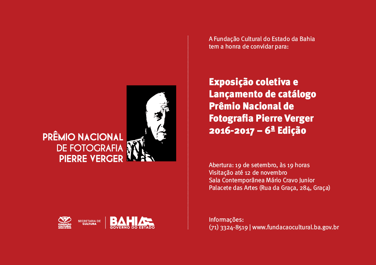 Fotografias de Paulo Luiz Coqueiro Andrade (Bahia), Gilvan Caldas de Sá Barreto Filho (Rio de Janeiro) e Ilana Bar Nissin Wirgues (São Paulo), os vencedores das três categorias do Prêmio Nacional de Fotografia Pierre Verger – 2016/2017, serão reunidas para a exposição com premiados e mais 12 selecionados da sexta edição do concurso. A mostra homônima ao prêmio será aberta no dia 19 de setembro, terça-feira, às 19h, na Sala Contemporânea Mario Cravo Jr., Palacete das Artes, Graça, e pode ser visitada até 12 de novembro.