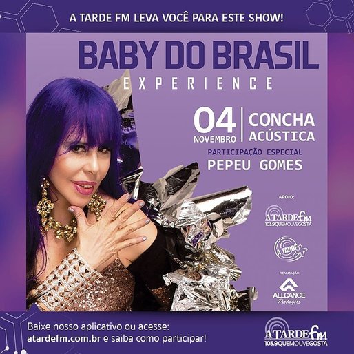 A cantora Baby do Brasil apresenta, no dia 4 de novembro, em Salvador, o show “Baby do Brasil Experience” na Concha Acústica do Teatro Castro Alves. Ela está acompanhada de sua nova banda, que traz nomes como Frank Solari na guitarra, o baterista Jorginho Gomes, André Gomes no baixo, Dudu Trentin nos teclados e Daniel Santiago, no violão e guitarra.