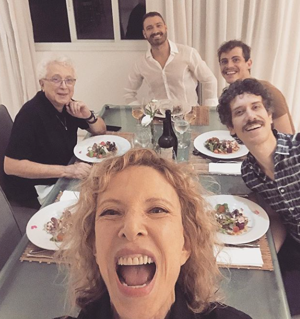 Marília Gabriela com Aguinaldo Silva nas redes sociais. Ela festejando o grande amigo que vai possibilitar montagem da peça Casa de Bonecas- parte 2. Na foto estão @laurovidal @theocochrane @balthazarthiago.