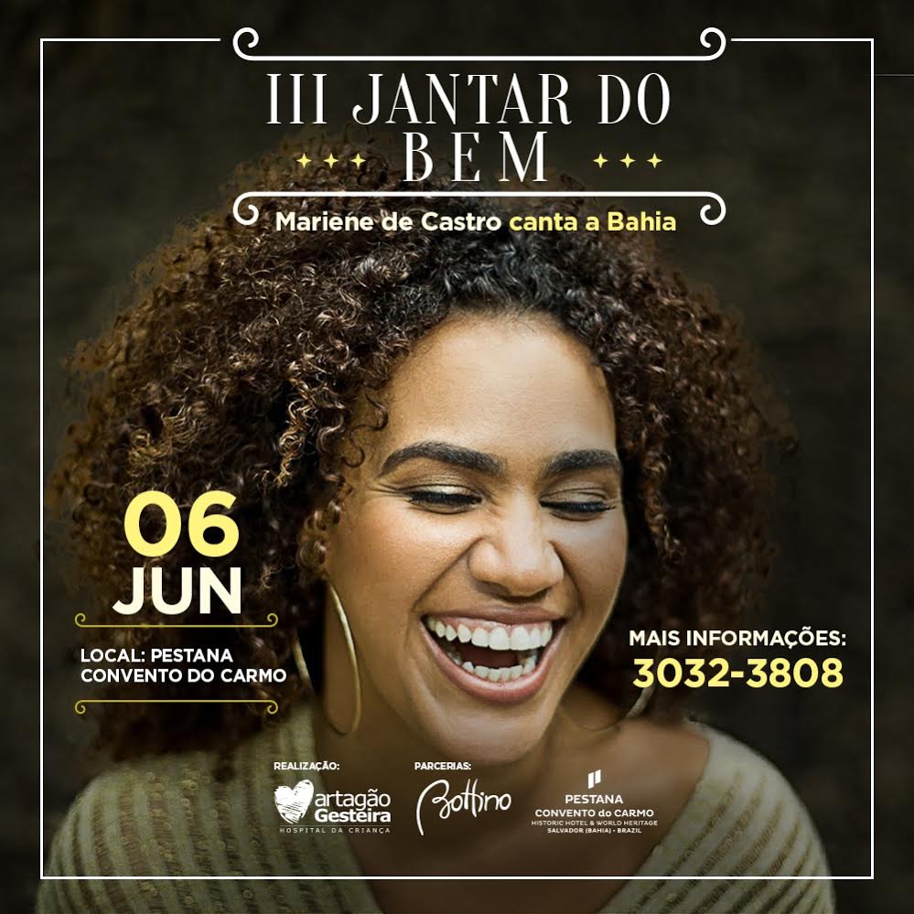 E vem por aí o III Jantar do Bem no próximo dia 6 de junho no Pestana Convento do Carmo. Esta edição será embalada pela maravilhosa Mariene de Castro cantando a Bahia. Tudo em prol ao Martagão Gesteira.