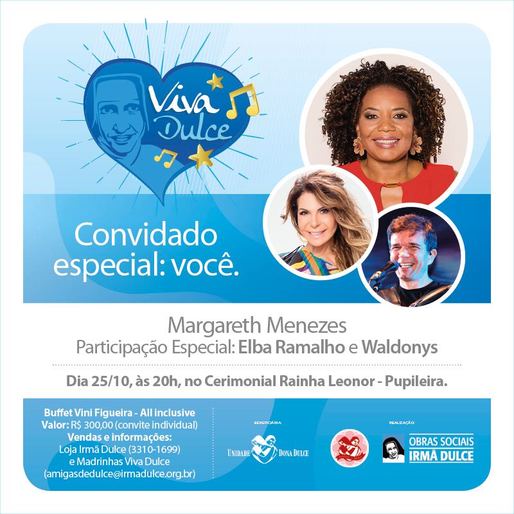 As Obras Sociais Irmã Dulce (OSID) estão em campanha para ampliação da Unidade Dona Dulce Lopes Pontes - espaço voltado ao atendimento de pacientes com câncer em tratamento na instituição do Anjo Bom da Bahia. Para marcar a ação solidária, a OSID, juntamente com a rede de voluntárias Amigas de Dulce, promovem no dia 25 de outubro, às 20h, no Cerimonial Rainha Leonor (Pupileira), o show Viva Dulce. Comandada pela cantora Margareth Menezes, a noite festiva, com renda totalmente revertida ao projeto de ampliação da unidade, contará com a participação especial de Elba Ramalho e do acordeonista Waldonys. O evento terá ainda buffet all inclusive, assinado pelo renomado chef Vini Figueira. Os ingressos custam R$300 e já estão à venda na Loja Irmã Dulce, localizada na Avenida Bonfim, ao lado da sede das Obras Sociais.