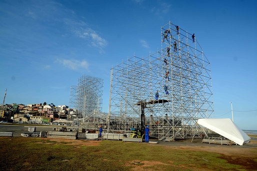 Até o momento, os funcionários da ST Estruturas, fornecedora contratada pela Empresa Salvador Turismo (Saltur), já fizeram a base e começaram a montar a parte lateral da cenografia e a cobertura – esta última é armada no chão para, depois, ser erguida. A previsão é que o equipamento fique pronto com até dois dias de antecedência ao festival para que passe por testes.