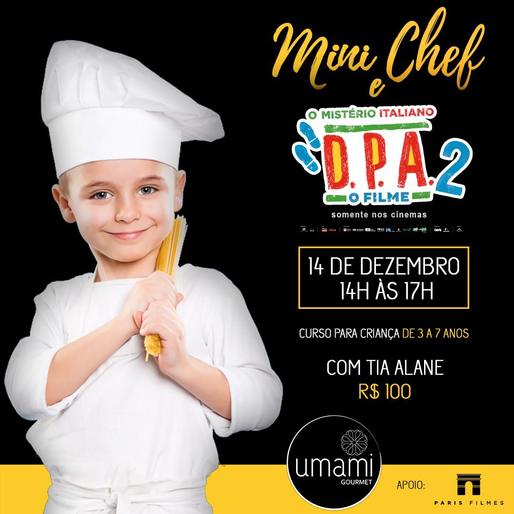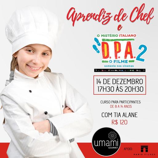 Numa parceria inédita com a Paris Filmes e o canal Gloob, o Centro Gastronômico Umami Gourmet oferece os projetos Mini Chef e Aprendiz de Chef no próximo dia 14 de dezembro, na sua sede, no Morro do Gato. O primeiro, para um público de 3 a 7 anos, acontece das 14h às 17h, enquanto o segundo, voltado para crianças de 8 a 14 anos, acontece das 17h30 às 20h30. Os cursos serão ministrados por Tia Alane e nascem de uma parceria com o filme D.P.A. 2 – O Mistério Italiano, nos cinemas.
