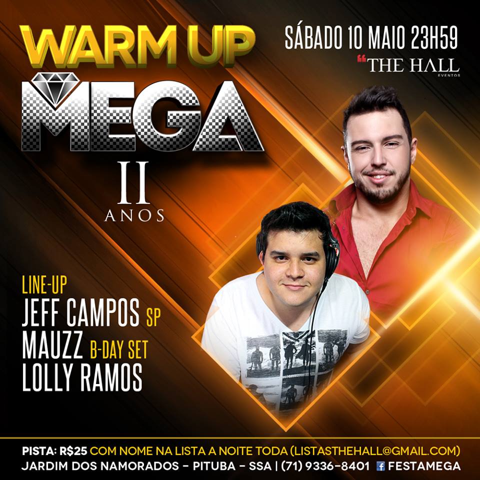 Neste sábado (10), a THE HALL irá receber o Warm Up da festa MEGA. Antecipando o clima da grande festa, os DJs Jeff Campos, Lolly Ramos e Mauzz irão animar a balada a partir das 23h59.