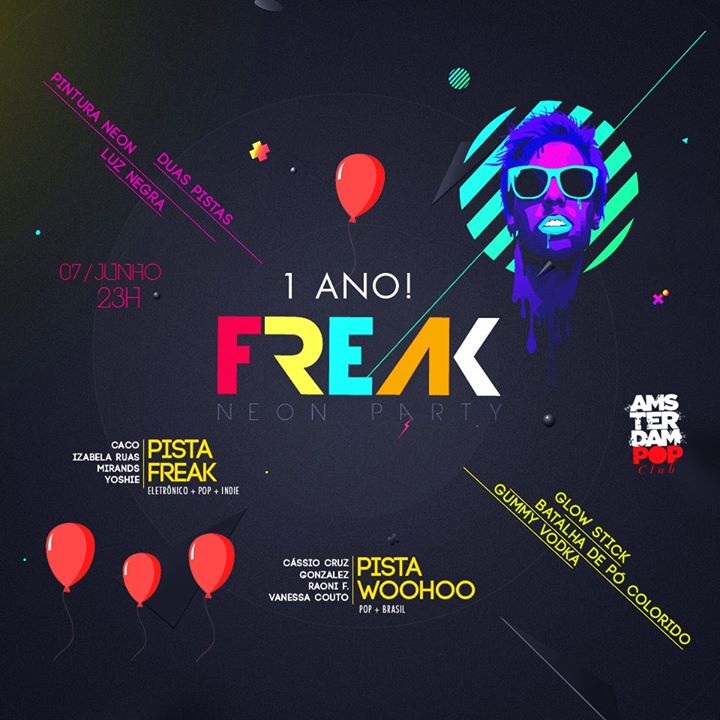 No sábado, 7 de junho, a FREAK comemora um ano de vida e chega mais brilhante do que nunca, junto com edição especial da WOOHOO. O público poderá se sujar de pó colorido na pista externa com a WOOHOO, se pintar de tinta fluor e brilhar muito no neon da FREAK, na pista interna. Os 100 primeiros não pagam nada para entrar na festa!