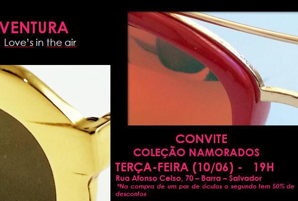 Ao som de “Love is in the air”, a Ótica Ventura vai apresentar uma coleção especial para o Dia dos Namorados, na noite dessa terça-feira (10), a partir das 19h, no bairro da Barra (Rua Afonso Celso, 70). A franqueada Daniela Simões vai receber os convidados em clima de coquetel e todos os clientes que comprarem um par de óculos, ganharão 50% de desconto no segundo.