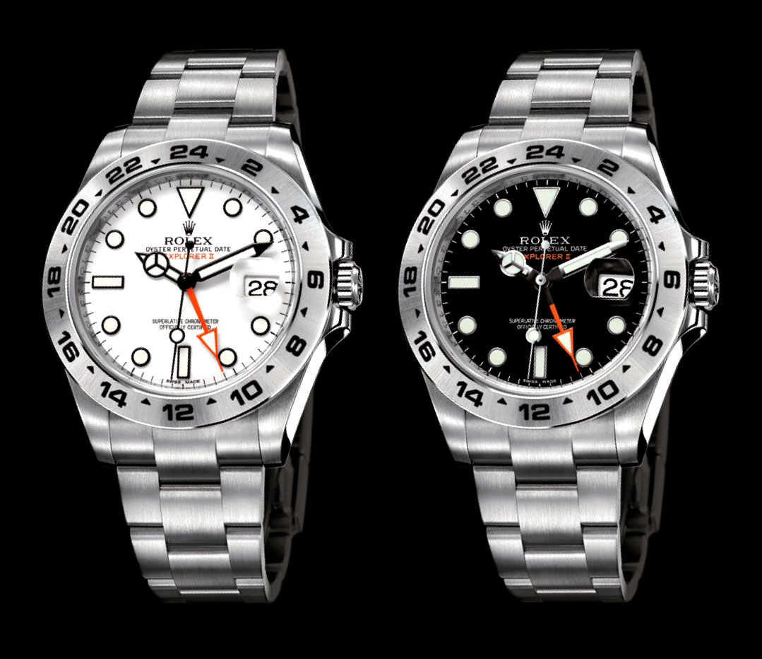 Explorer II: O espírito de aventura e pioneirismo são as principais referências desse relógio. O ponteiro de 24h retomou aforma de flecha e a cor laranja, como o original lançado em 1971, e o ponteiro de 12h pode ser configurado de maneira independente para indicar um segundo fuso horário, em associação com o ponteiro de 24h e a luneta.