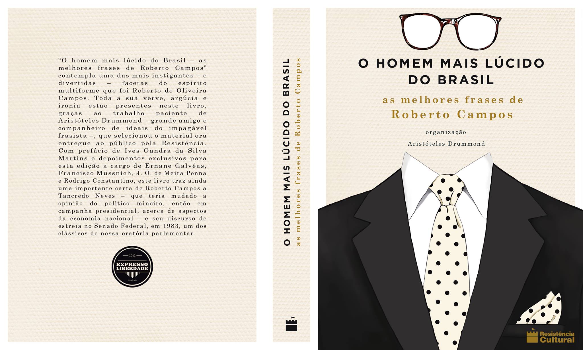 O homem mais lúcido do Brasil – as melhores frases de Roberto Campos, organizado por Aristóteles Drummond, prefaciado por Ives Gandra da Silva Martins, traz depoimentos exclusivos de Ernane Galvêas, Francisco Mussnich, J. O. de Meira Penna e Rodrigo Constantino, além de uma importante carta de Roberto Campos a Tancredo Neves – que teria feito com que o político mineiro, então em campanha presidencial, mudasse sua posição sobre aspectos da economia nacional – e o seu discurso de estreia no Senado da República, em 1983, um clássico de nossa oratória parlamentar. Esta charmosa edição de bolso em capa dura é uma justa homenagem da Livraria Resistência Cultural Editora e do Expresso Liberdade ao grande Roberto Campos. Quase 500 frases de pura verve.