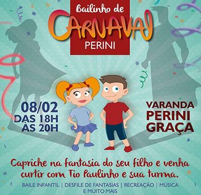 E quem disse que os pequeninos ficarão fora da folia momesca? Neste domingo, dia 08 de fevereiro, na varanda da Perini Graça, vai acontecer o tradicional Bailinho de Carnaval Perini, das 18h às 20h, exclusivo para clientes Cartão Perini. A grande festa será animada por Tio Paulinho e a Turma do Happy e terá baile infantil, desfile de fantasias, recreação, música e muito mais. Para participar, os clientes Cartão Perini devem fazer a reserva através da Central de Relacionamento (71) 2108-0008. As vagas são limitadas. Os clientes que confirmarem presença no Bailinho da Perini receberão um cupom promocional que dará direito a uma bola de sorvete na compra do combo Coxinha Catupiry+Refri 300ml. Esta promoção é válida somente no dia 08 de fevereiro, na loja da Graça.