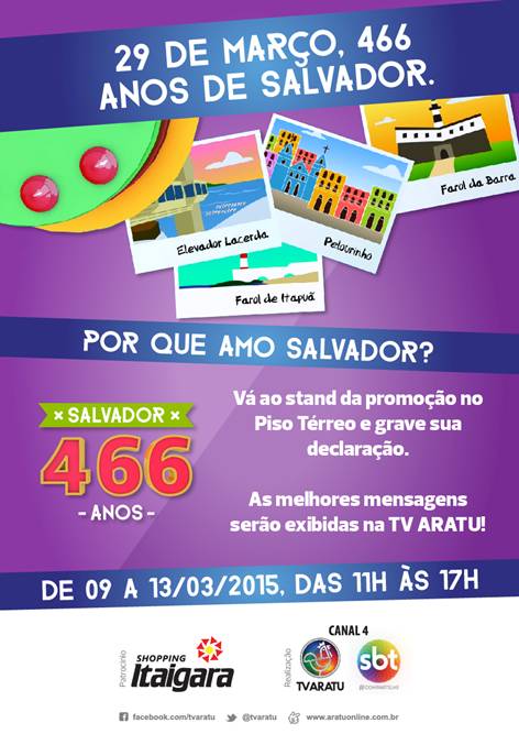 No dia 29 de março, Salvador irá completar 466 anos. E você quer demonstrar seu relação de amor com a capital? A TV Aratu está com uma ação especial! Entre os dias 09 e 13, a emissora irá convidar os telespectadores para gravar declarações sobre sua história com a capital, uma das mais belas e vistas do Brasil. A ação “Por que amo Salvador?” irá acontecer no Piso Térreo do Shopping Itaigara, patrocinador do projeto. Um backdrop com uma câmera funcionará das 11h às 17h e estará disponível para que baianos e turistas gravem seus depoimentos. As melhores declarações serão exibidas na programação da TV Aratu.