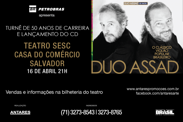 A turnê 2015 do duo mundialmente consagrado, formado por Sérgio e Odair Assad, percorrerá ao todo 14 cidades e próximo dia 16 de abril será a vez do público soteropolitano assistir ao Duo Assad. A apresentação única será no Teatro Casa do Comércio, as 21h.