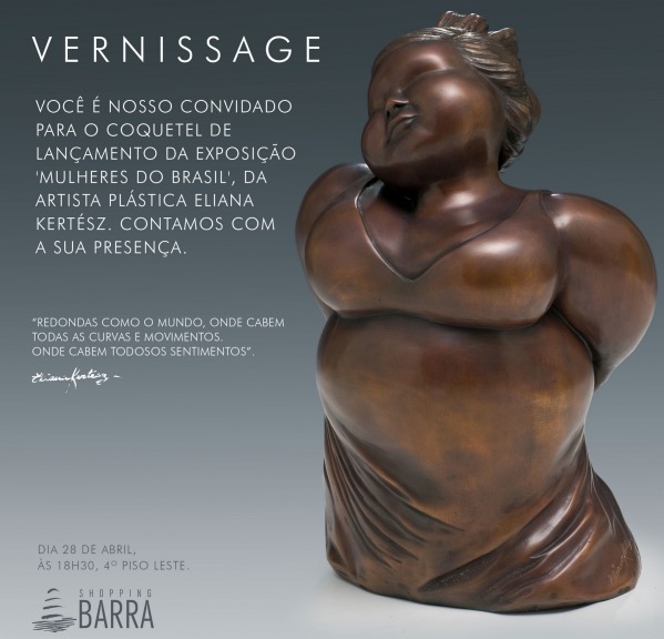 Eliana Kertez a mil nos preparativos de sua exposição, próxima terça-feira ( 28 de abril)no Shopping Barra. A mostra Mulheres do Brasil que já percorreu inúmeros Estados Brasileiros, traz as famosas Rechonchudas em barro, resina, fibra de vidro e bronze. Segundo a artista plástica a “A mulher brasileira é uma guerreira que usa as armas que pode, com sentimento, sem vergonha de ser feliz”.