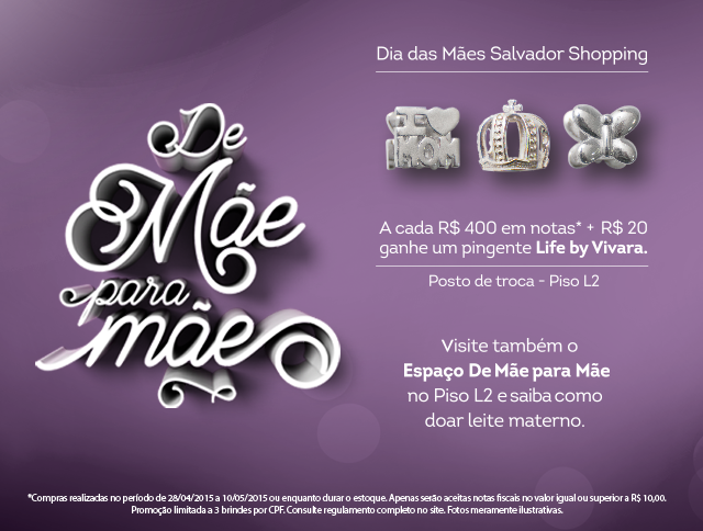 Entre os dias 28 de abril e 10 de maio, os consumidores que apresentarem notas ou cupons fiscais que somem R$ 400 em notas exclusivas do centro de compras, além do pagamento de R$20 em espécie, podem realizar a troca por um dos três modelos de pingente Life by Vivara. O Salvador Shopping possui mais de 460 opções de lojas, que atende todos os perfis de mães, com mix que contempla marcas exclusivas, grifes nacionais e internacionais.