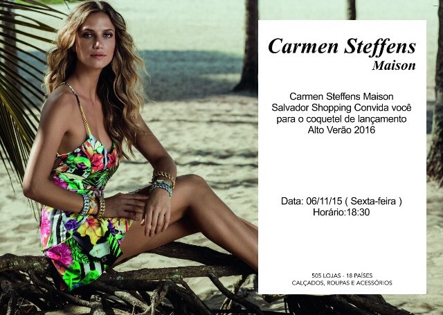 Na próxima sexta(06), a Carmen Steffens Maison do Salvador Shopping, receberá seus clientes e formadores de opinião para um badalado coquetel de lançamento da coleção Alto Verão 2016. Além da charmosa recepção, a loja também sorteará em parceria com a RR Náutica, um luxuoso passeio de lancha para seus clientes.