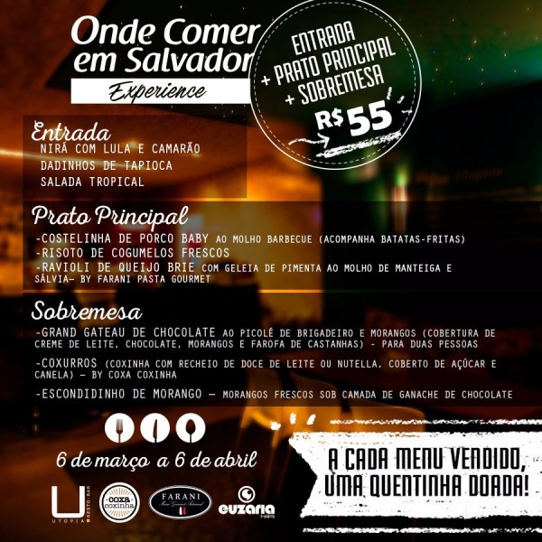 Está chegando o "Onde Comer em Salvador Experience"! A iniciativa da Blogger Gabriela Martinez, nome por trás do blog Onde Comer em Salvador, tem um intuito de facilitar a apreciação da boa gastronomia na cidade e é bacanérrima! O Utopia Resto-Bar vai sediar essa edição, famosos por suas roskas, em parceria com a marca Euzaria e o Blog tornando imperdível! De 6 de Março a 6 de Abril, realmente não dá pra perder!