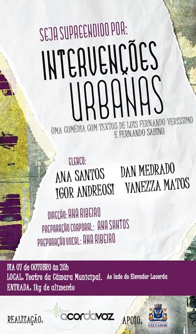 Dia 07 de outubro, próxima sexta, às 20:00h, estará em cartaz a peça "Intervenções Urbanas" em apresentação única a ser realizada no Teatro da Câmara de Salvador, que fica ao lado do Prédio da Prefeitura.