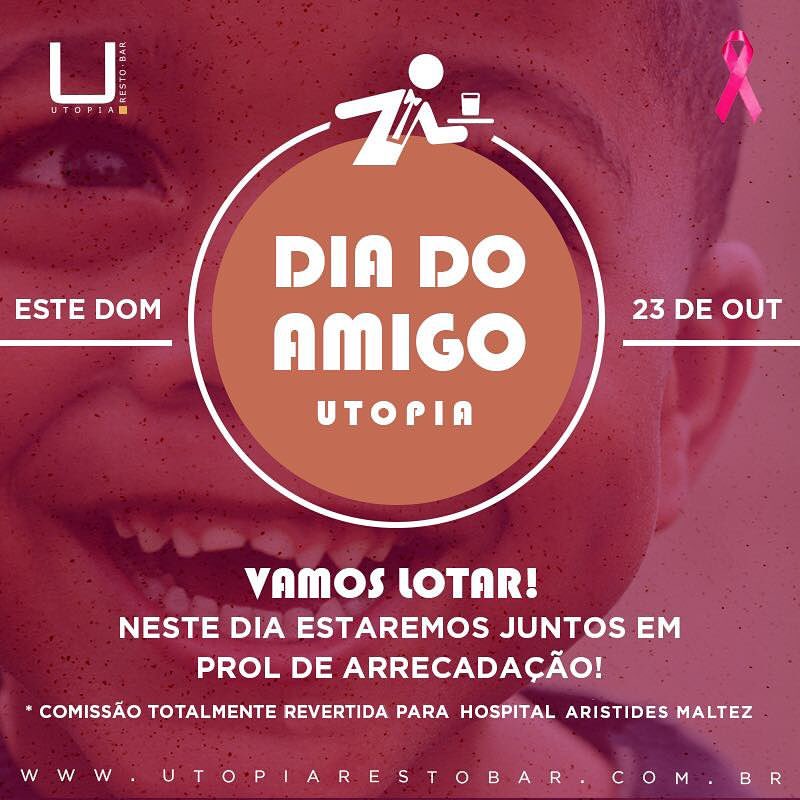Nesse Outubro o já conhecido Utopia Restobar está fazendo algumas ações para arrecadar fundos para o Hospital Aristides Maltez, e nesse domingo vai ter um bem bacana, será o Dia do Amigo Utopia! Nesse dia vão dispensar os garçons e amigos voluntários atenderemos os clientes para que o valor destinado ao serviço seja direcionado ao HAM! Quer coisa melhor que se divertir e ainda fazer o bem ? dica para o final de domingo.