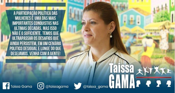 "A participação política das mulheres é uma das mais importantes conquistas nas últimas décadas, mas isso não é o suficiente. Temos que ultrapassar os desafios que ainda persistem, em um cenário político desigual e longe do que desejamos. Venha com a gente! Palavras de Taissa...