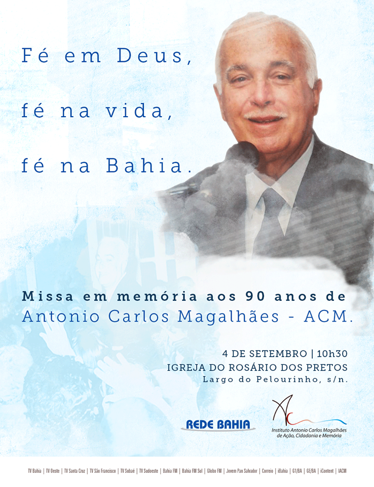 Se vivo fosse, o nosso saudoso ACM completaria 90 anos nesta segunda-feira próxima , dia 4 de setembro. Um data inesquecível que amanhecia com rojões na alvorada no bairro da Graça. A data será lembrada, dia 4 de setembro, com uma missa em memória, as 10.30, na Igreja do Rosário dos Pretos no Largo do Pelourinho.