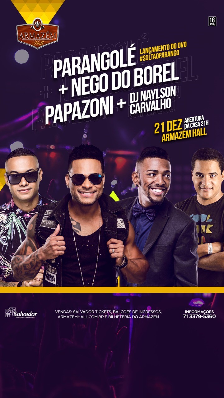 Dia 21 de Dezembro, o Armazém Hall vai receber o Parango para lançar o Dvd "Solta o Parango", gravado em Porto Seguro. Recheado de sucessos antigos e inéditos, o Parango registra mais este grande momento na carreira desta banda que já ultrapassa 2 décadas. Tendo no comando o irreverente Tony Salles e com músicos que ao assumirem seus instrumentos contagia todos com a sua musicalidade, o parango comemora mais um ano de sucesso com o lançamento deste Dvd, dia 21 de Dezembro (Quinta), no Armazém Hall, a partir das 21:00. E como esta turma do Parango vive aprontando, no lançamento do Dvd não poderia ser diferente não é verdade, pensando em fazer desta noite inesquecível os meninos convidaram Nego do Borel, Papazoni e Dj Naylson Carvalho para abrilhantar ainda mais esta festa.