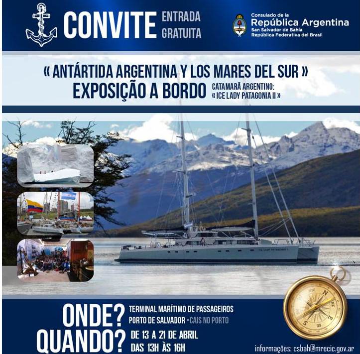 Está chegando à Salvador, o catamarã argentino “Ice Lady Patagônia II”, embarcação de propriedade da Associação de Exploração Cientifica Austral, sem fins lucrativos, com 15 anos de existência e que traz a bordo um museu de vídeos, fotos e mapas sobre a geografia, a fauna, a flora e a história da Antártida Argentina.