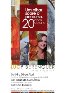 O amor, a paixão, a ilusão, a dor, a saudade, a música, a poesia, o abraço e mais de 20 de anos de experiência. Tudo isso retratado em telas, será contemplado com a exposição ‘Um olhar sobre o percurso – 20 anos de arte’ na Casa do Comércio. A mostra retrata toda trajetória artística de Lucy Berenguer, que comemora duas décadas de pintura. O lançamento acontece no próximo dia 4 de abril, às 19 horas. A exposição ‘Um olhar sobre o percurso – 20 anos de arte’ fará uma viagem sobre os trabalhos realizados da artista ao longo da carreira no Brasil e em países como Portugal e República Dominicana. Foram dez exposições individuais e 11 exposições coletivas, além de feiras, capas de livros, mostra de rua, que proporcionaram para Lucy grandes experiências no mundo das artes plásticas.