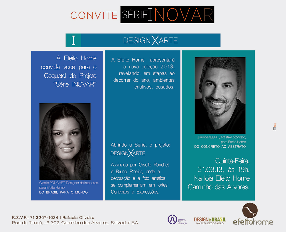Outra movimentação social do dia, na área de decoração, fica por conta da nova coleção 2013 no projeto Série Inovar, revelando em etapas um ambiente criativo, ousado e com referências à arte e à cultura nacional. A primeira série, que traz um ambiente assinado pela designer de interiores Giselle Ponchet, com destaque para a obra de arte do fotógrafo Bruno Ribeiro, será aberta com coquetel para convidados, mogo mais, a partir das 19hs, na Rua Timbó, no Caminho das Árvores.