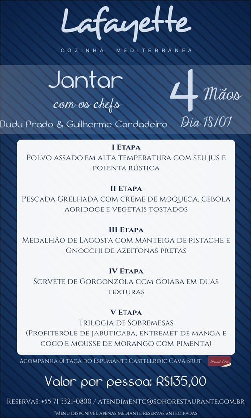 Para quem gosta de uma boa gastronomia mediterrânea reserve com urgência este Jantar a 4 Mãos no Restaurante Lafayette, na Marina em Salvador. Dois nomes de peso, Dudu Prado e Guilherme Cardadeiro, dia 18 de julho, com um cardápio pra lá de bacanérrimo.