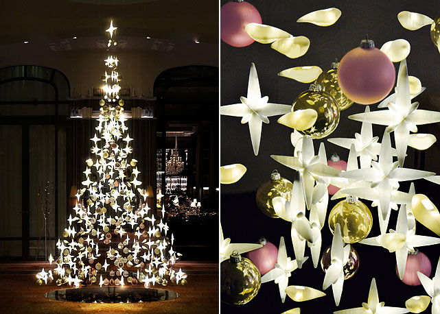 Está um deslumbre a árvore de Natal do Le Royal Monceau – Raffles Paris criada pela artista francesa Sylvie Maréchal. Totalmente feita a mão, a peça demorou mais de seis meses para ficar pronta. Presa ao teto por 221 cabos, a árvore é composta de mais de 600 peças individuais, incluindo 420 pássaros e estrelas, em porcelana Limoges. Mais de 4 mil lâmpadas de LED encravadas nas peças dão a impressão de faiscas que brilham durante o dia e à noite.