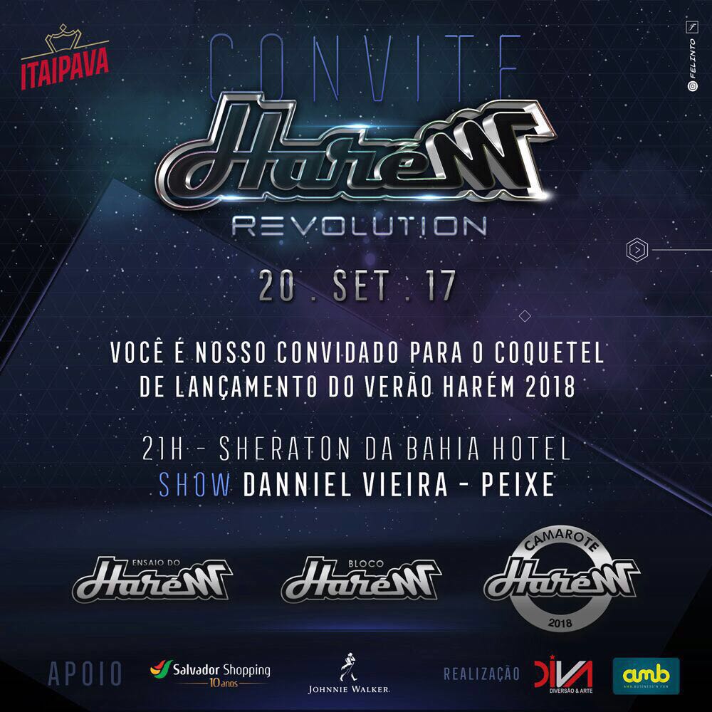 E vem por aí o Harém Revolution. O lançamento será logo mais, as 21h, no Sheraton da Bahia Hotel com show de Danniel Viera - Peixe.