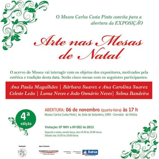 O Museu Carlos Costa Pinto convida para a abertura da Exposição ARTE NAS MESAS DE NATAL - 06 NOV às 17h.