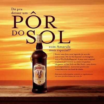 Eu adorei a idéia e compartilho com vocês. O licor sul-africano Amarula lançou um concurso cultural de verão para escolher a melhor foto de pôr do sol. Os interessados poderão postar as imagens no site Instagram. A campanha vai até o dia 28 de fevereiro. A ação é desenvolvida pelas agências Comunicação 3 e El Camino.
