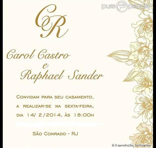 É hoje o casório de Carol Castro e Raphael Sander em São Conrado, na Zona Sul do Rio de Janeiro. A cerimônia será íntima, apenas para os familiares e amigos mais próximos.
