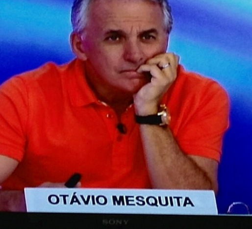 Otavio Mesquita observando Silvio Santos apresentar um programa de auditório. "Mega aula Master class!!! Incrível! Ele edita o programa no ar...inacredotável!!