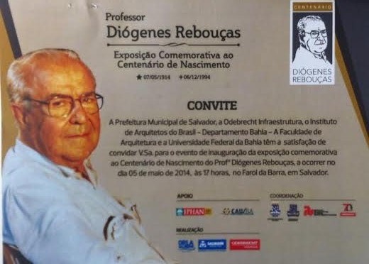 Acontece em Salvador hoje a partir das 17hs, no Farol da Barra, exposição comemorativa ao Centenário de Nascimento do Professor Diógenes Rebouças. Uma realização da Prefeitura de Salvador e Odebrecht, Coordenação da UFBA-Faculdade de Arquitetura, com Apoio do IPHAN e CAU/BA.