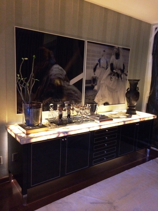 Já no living assinado pelo arquiteto Marlon Gama, o luxo ganha um conceito inovador na aplicação do mármore calacata translúcido sobre uma peça exclusiva da linha Manhattan, criando uma proposta inédita de móvel-bar na mostra baiana de decoração.