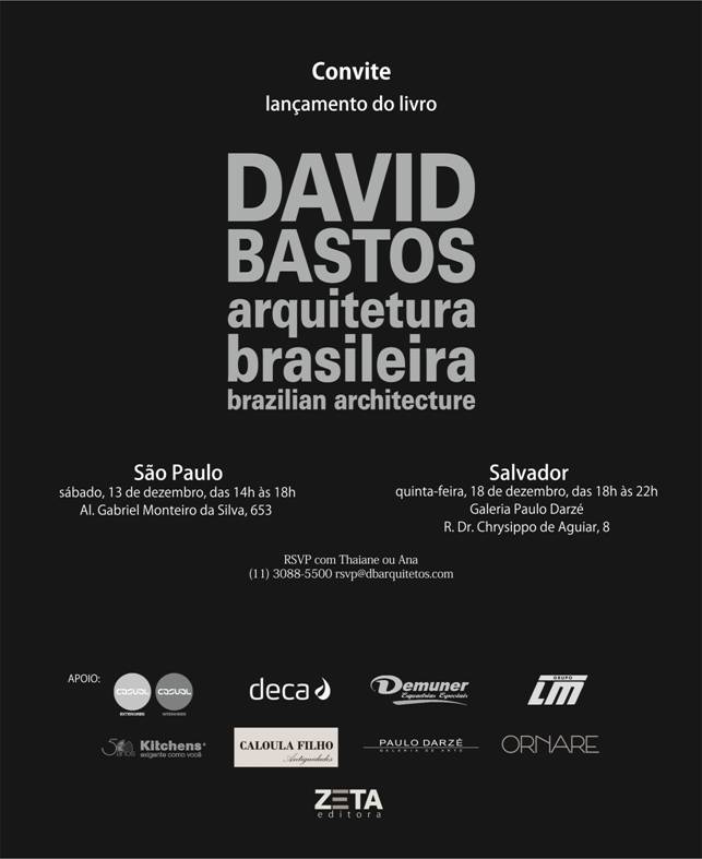 E como já publicamos de primeira mão, já está circulando o convite do lançamento do livro de David Bastos que promete chacoalhar a Gabriel Monteiro da Silva, dia 13 de dezembro, em Sampa, e dia 18 de dezembro congestionar a Vitória, das 18 ás 33hs, na Galeria Paulo Darzé.